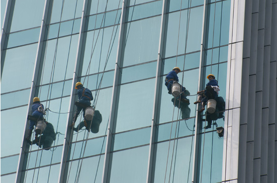 高空作业难度大,危险性高。特此我们的施工人员是经过专业培训后及有多次高空作业经验。我们一直采用坐式吊绳清洁方法: